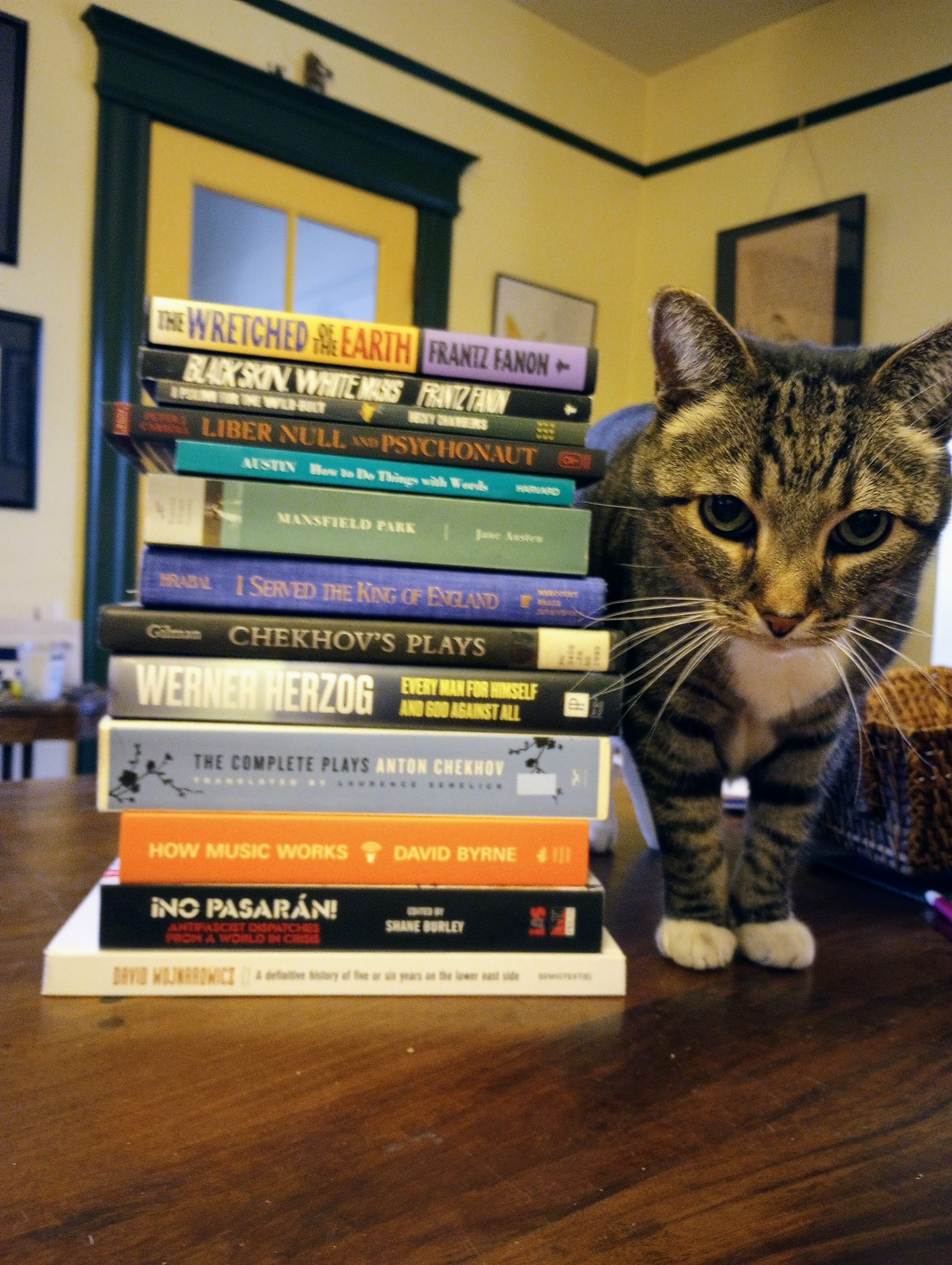 Here is a blurry shot of the books I would like to think I might read this year, along with a nice photo of Loki, the cat.